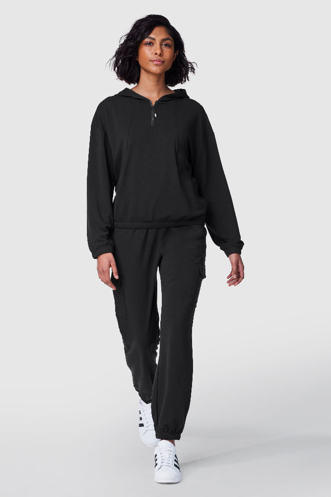 Introducing the FWD DrapeKnit Hoodie — crafted with recycled materials because sustainability is key. Stay dry and fresh with its moisture-wicking and anti-odor finishes. It features an adjustable hem for a customizable fit and a sleek half zip for easy layering. Whether you're hitting the trails or lounging at home, this hoodie keeps you comfortable and looking sharp.